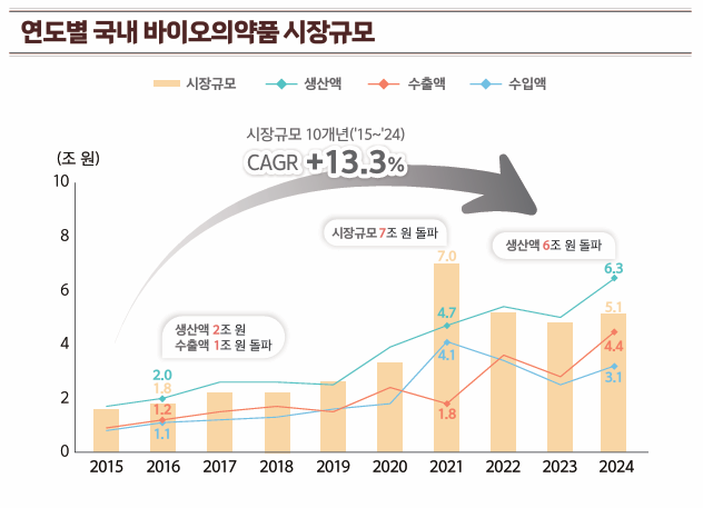 2024년 우리나라 바이오의약품 시장 규모는 약 5조 원을 돌파하며 최근 10년간 연평균 13.3%의 고성장을 이어갔다.