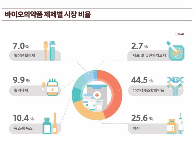 바이오의약품 제제별 시장 점유율은 유전자재조합의약품이 44.5%로 가장 높았으며, 그 뒤를 백신(25.6%), 독소·항독소(10.4%), 혈액제제(9.9%), 혈장분획제제(7.0%), 세포 및 유전자치료제(2.7%)가 뒤를 이었다.