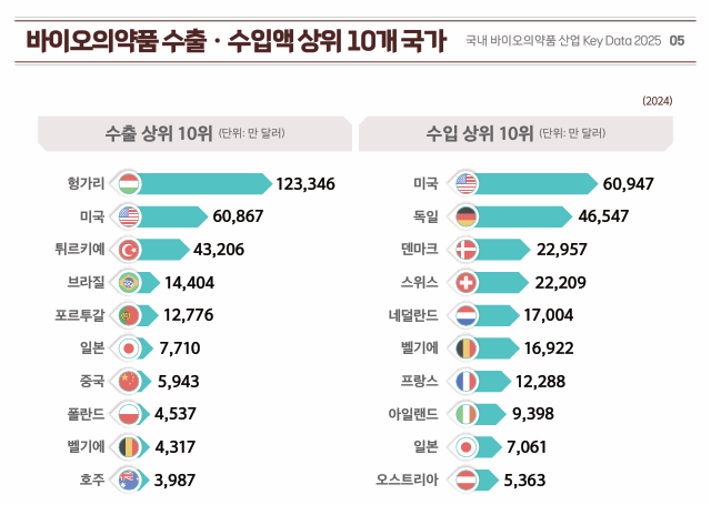 바이오의약품 무역수지는 약 9억 1692만달러(한화 약 1조3000억원) 흑자로 역대 최대치를 기록했다. 주요 바이오의약품 수출국은 헝가리로 12억 3,346만 달러(약 1.7조 원)를 기록했으며 그다음으로 미국과 튀르키예 순이었다. 반대로 주요 바이오의약품 수입국은 미국으로 6억 947만 달러(약 7,435억 원)로 집계되었고 뒤이어 독일, 스위스 순으로 나타났다.