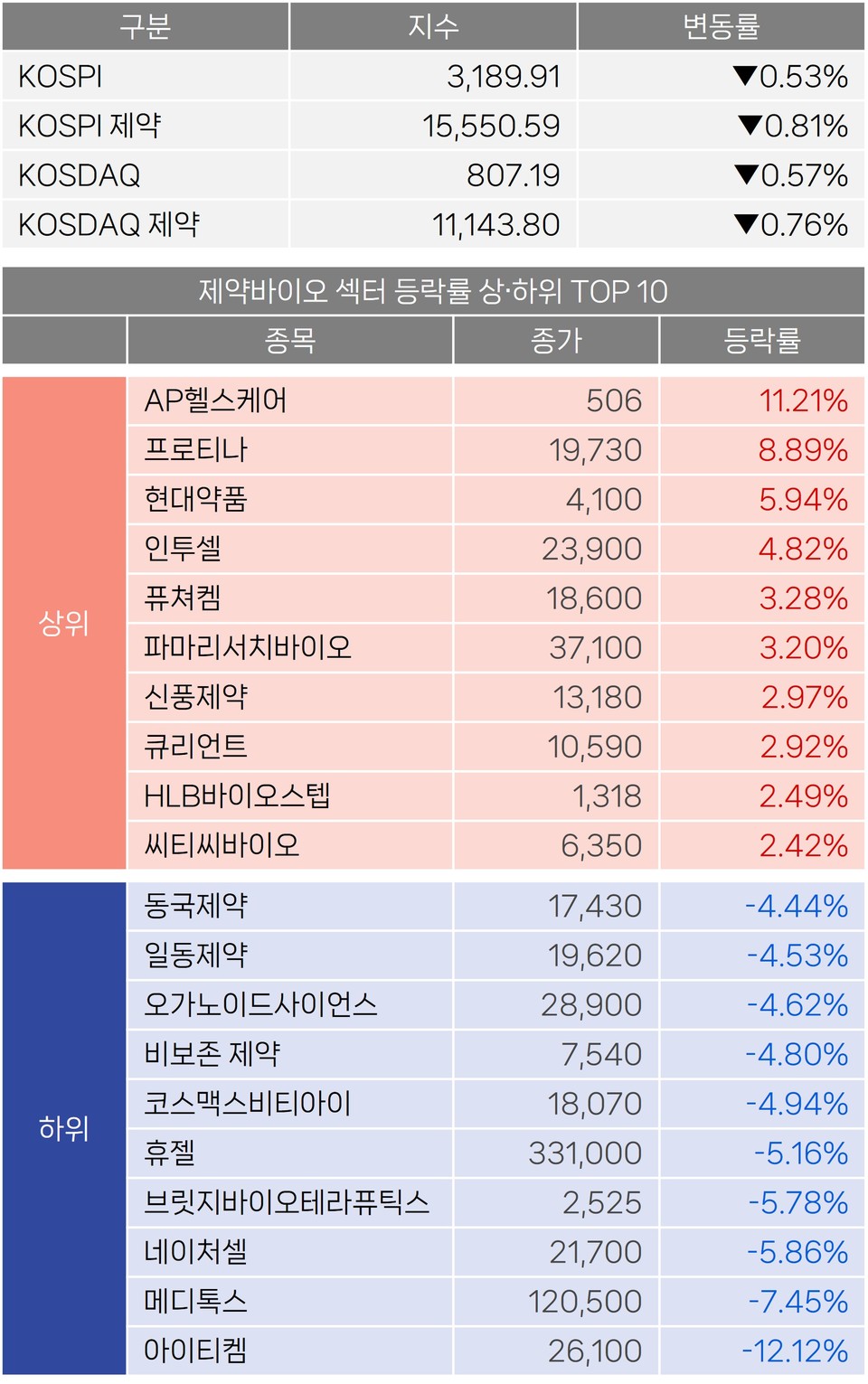 12일 한국거래소에 따르면 코스피 지수는 전 거래일보다 16.86포인트(▼0.53%) 내린 3189.91에 마감했다. 코스닥 지수는 4.66포인트(▼0.57%) 하락한 807.19를 기록했다. 업종별로는 KOSPI 제약 지수가 15550.59로 0.81% 하락했고, KOSDAQ 제약 지수는 11143.80으로 0.76% 떨어졌다.
