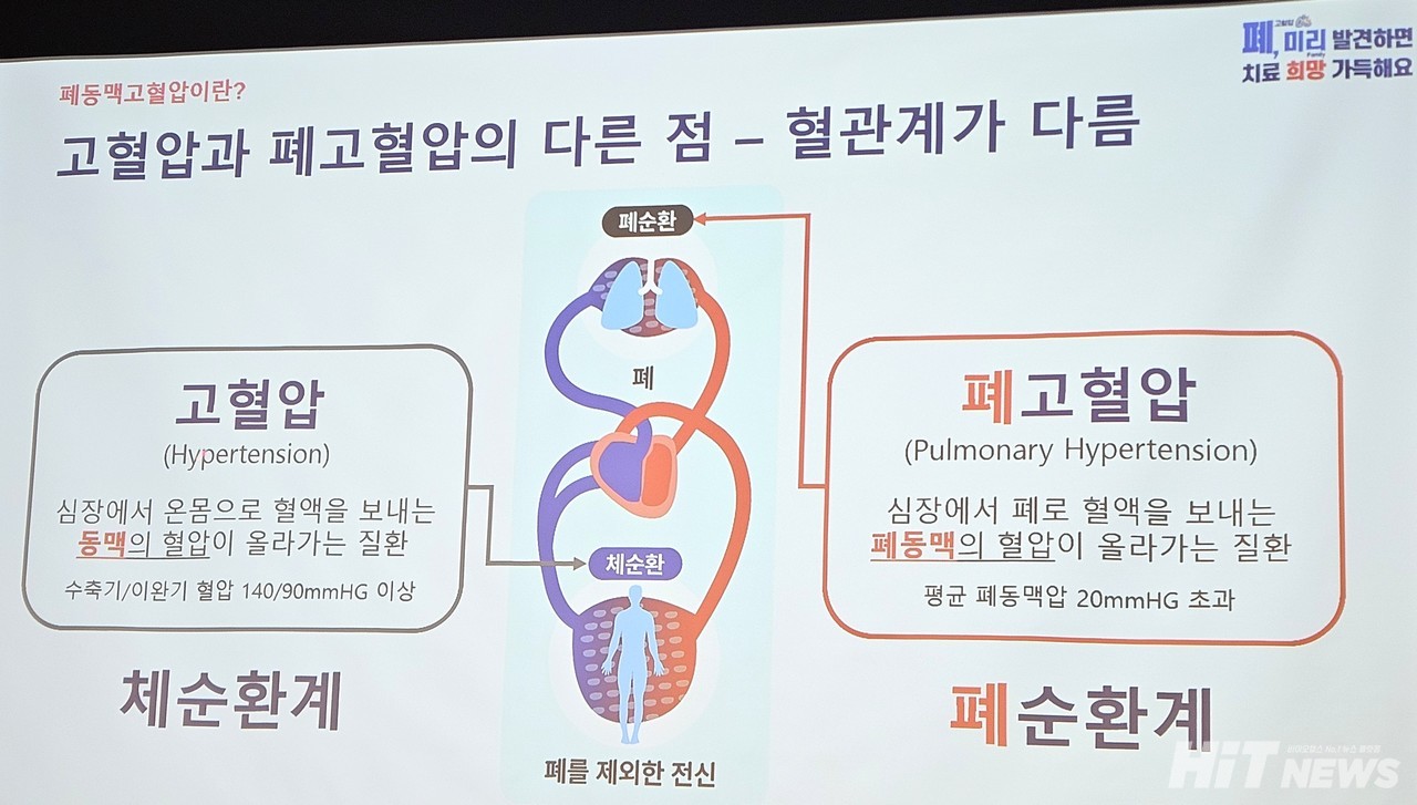 정욱진 가천대 길병원 심장내과 교수(심부전폐고혈압센터장, 대한폐고혈압학회 회장)는 "흔히들 고혈압과 폐고혈압을 같은 질환으로 인식하는 경우가 많은데, 고혈압은 심장에서 온몸으로 혈액을 보내는 동맥의 혈압이 오르는 것이고, 폐고혈압은 심장에서 폐로 혈액을 보내는 폐동맥의 혈압이 오르는 것을 말한다"며 "즉, 우심실이 망가지고, 폐소동맥의 혈관 벽이 두꺼워진 질환"이라고 설명했다.