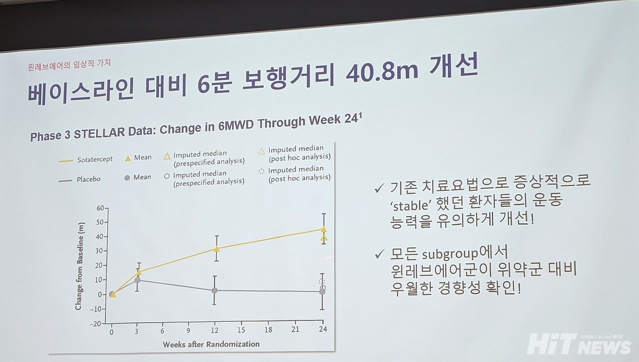김 교수는 "윈레브에어는 위약 대비 6분 보행 거리(Hodges-Lehmann 추정치)를 40.8m 증가시켰다(95% CI : 27.5-54.1, P<0.001). 임상적 악화 또는 사망 위험을 84% 낮췄으며(HR=0.16, 95% CI : 0.08-0.35), 2제 약제와 병용한 것보다 3제 병용한 환자 군에서 더 유의미한 결과를 보였다"고 설명했다.