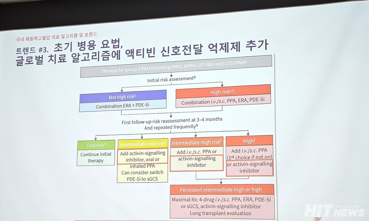 이어 "액티빈 신호전달 억제 기전의 첫 신약 윈레브에어의 등장으로, 기존 치료요법에 추가적인 병용요법이 가해졌다"며 "상태가 개선되지 않는다면 1가지씩 약제를 추가하는 '순차적 병용요법'을 사용하는 우리나라와 달리 효과적인 약제를 함께 빠르게 사용하자는 선진 국가의 '병용요법' 환경이 마련되고 있다. 대한폐고혈압학회도 해당 내용을 반영해 가이드라인 개선 작업을 수행하고 있다"고 덧붙였다.