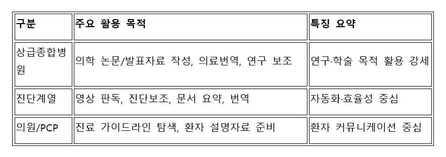 AI 업무 활용은 병원 유형과 진료 계열에 따라 뚜렷한 차이를 보였다. 상급종합병원 의사는 의학 논문 및 발표자료 작성, 의료번역, 연구 보조 등 연구·학술 목적으로 활용하는 비중이 높았고, 의원 및 일차진료의사(PCP)는 진료 가이드라인 탐색과 환자 설명자료 준비 등 환자 커뮤니케이션을 중심으로 활용하는 것으로 나타났다. 진단 계열에서는 영상 판독과 진단보조, 문서 요약, 번역 등 자동화·효율성을 중심으로 AI를 사용하고 있었다.