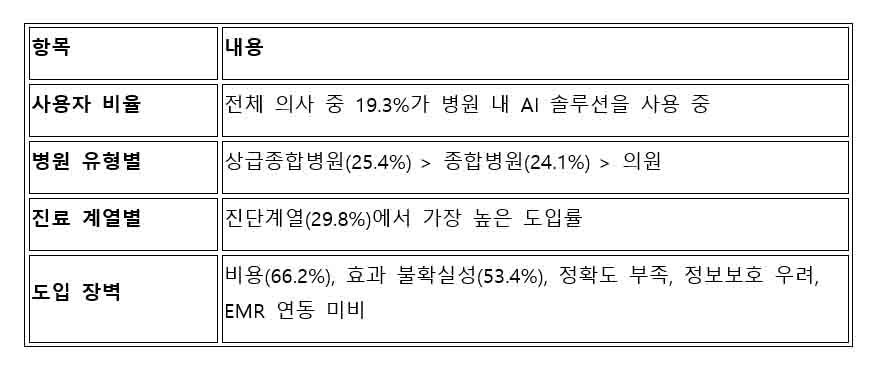AI를 개인적으로 사용하는 의사는 많았지만, 의료기관 시스템에 도입해 사용 중인 비율은 19.3%에 불과했다. 병원 유형별로는 상급종합병원(25.4%)과 종합병원(24.1%)이, 진료 계열별로는 진단계열(29.8%)에서 가장 높았다.