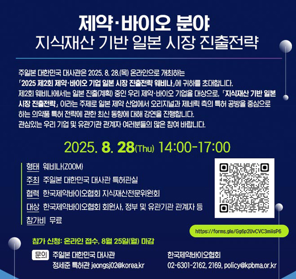 한국제약바이오협회(회장 노연홍) 지식재산전문위원회는 오는 28일 주일본대사관과 공동으로 '제2회 제약·바이오 기업 일본 시장 진출전략 웨비나'를 개최한다.