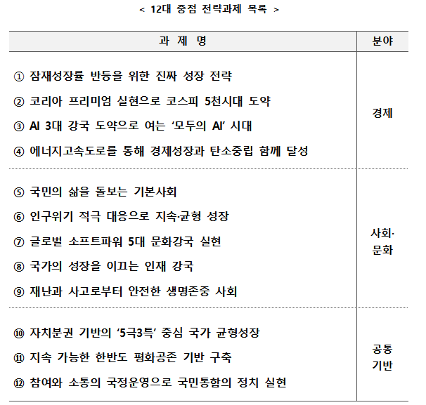 국정기획위는 이와 함께 12대 중점 전략과제를 선정해 범정부 차원의 집중 투입을 예고했다. 이를 뒷받침하기 위해 2026~2030년 5년간 총 210조원의 재정을 추가 투자하고, 세입 확충과 지출 효율화를 통해 재원 마련에 나선다. 입법·제도 정비도 속도전이 예상된다. 법률 731건 중 634건, 하위법령 220건 중 178건을 내년까지 정비 완료한다는 계획이다.