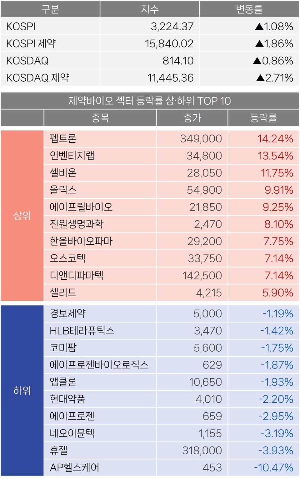 같은날 제약바이오 관련 개별 종목에서 셀비온(▲11.75%), 올릭스(▲9.91%), 에이프릴바이오(▲9.25%), 진원생명과학(▲8.10%) 등도 강세를 보였다.