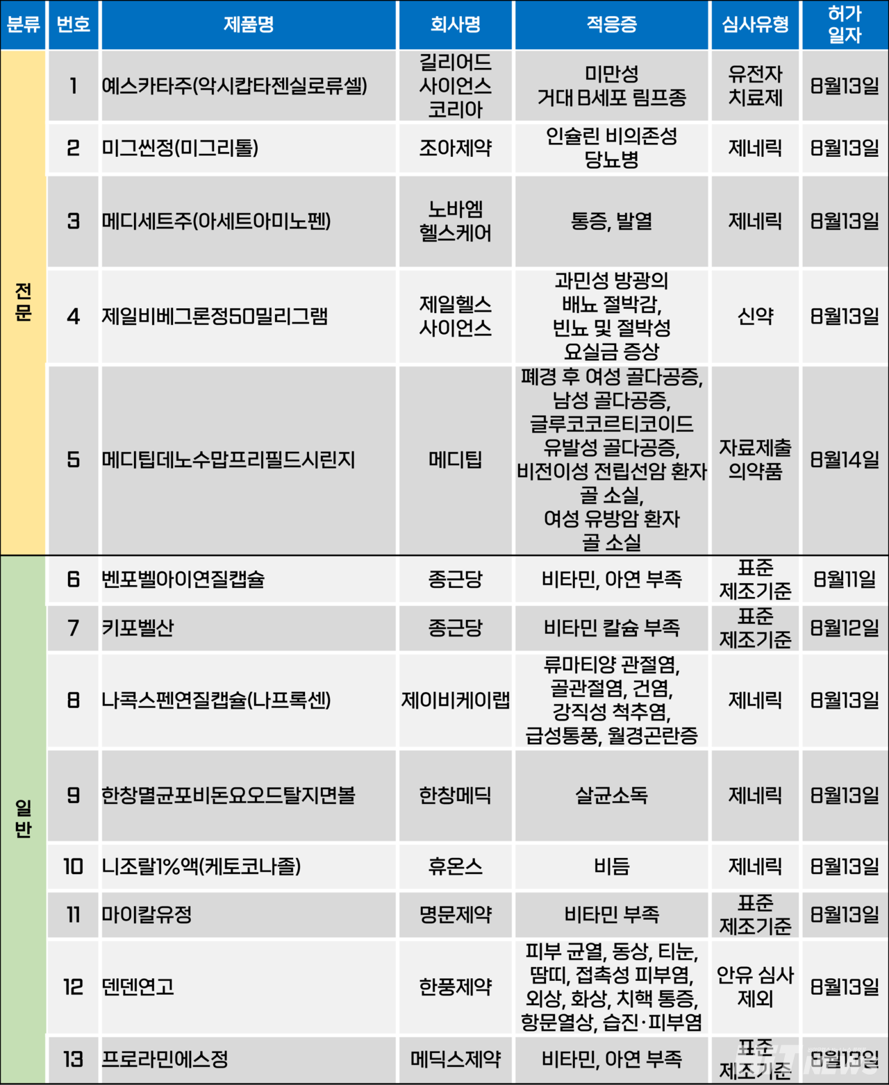 지난주(8월11~15일) 총 13개 품목이 식품의약품안전처에서 품목허가를 받았다. 전문의약품 5개, 일반의약품 8개 품목이다. 이들은 미만성 거대B세포 림프종, 인슐린 비의존성 당뇨병, 과민성 방광, 골다공증 등 적응증으로 허가됐다.