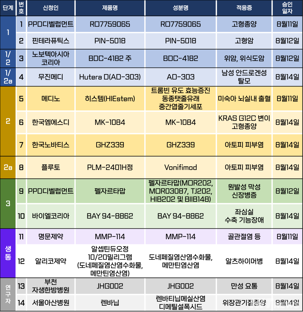 임상시험계획은 총 14건이 승인됐다. 세부적으로 △1상 2건 △1/2상 1건 △1/2a상 1건 △2상 3건 △2a상 1건 △3상 2건 △생물학적 동등성 2건 △연구자 임상 2건 등이다. 이 임상시험들은 남성 안드로겐성 탈모, 아토피 피부염, 원발성 막성 신장병증 등 질환을 대상으로 승인됐다.