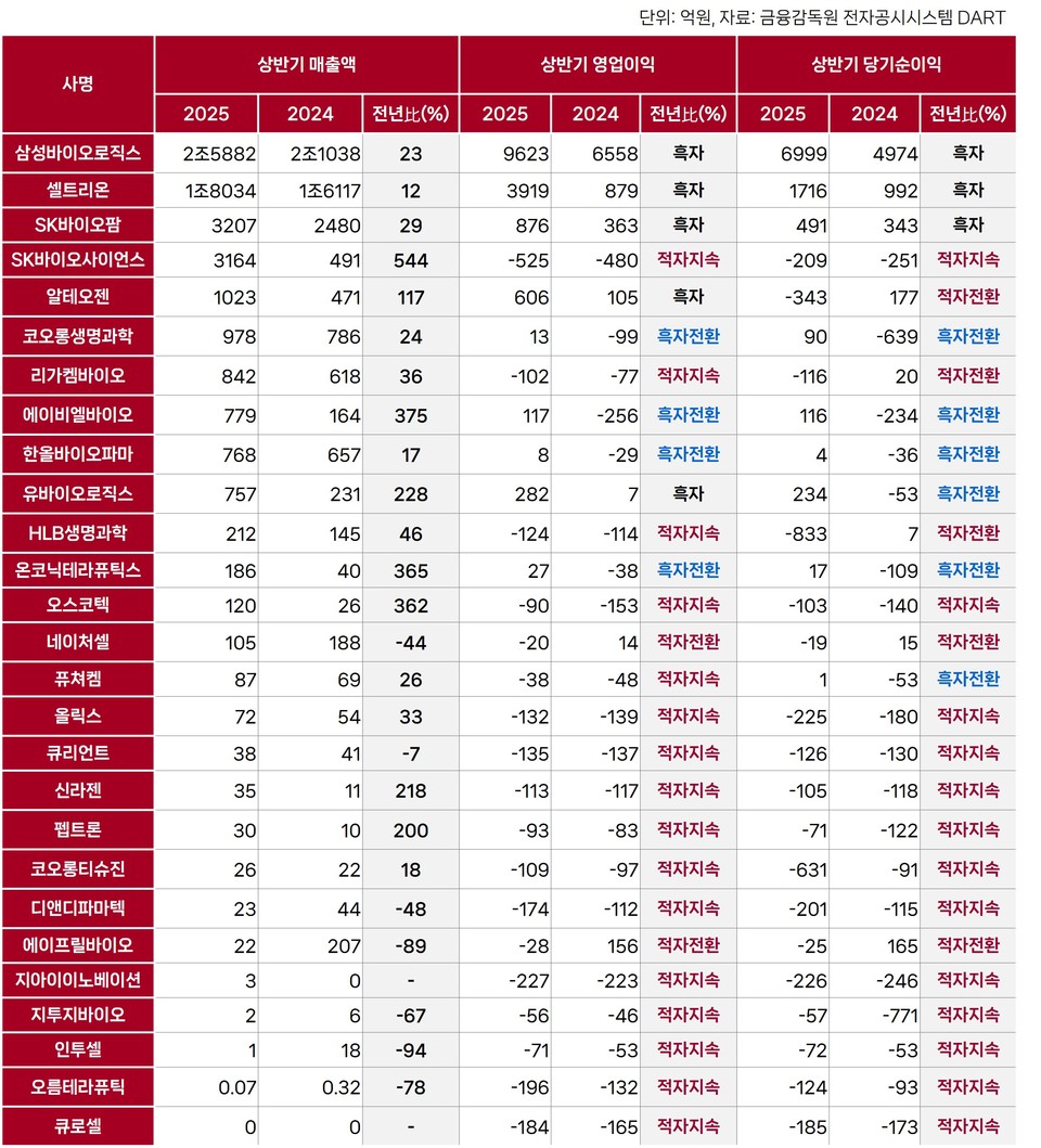 국내 주요 상장 바이오 기업들의 2025년 상반기 실적이 집계됐다. 삼성바이오로직스, 셀트리온, SK바이오팜 등 대형주는 안정적인 성장세를 이어간 반면 다수의 코스닥 기업들은 여전히 적자 구조에서 벗어나지 못하고 있는 것으로 나타났다.