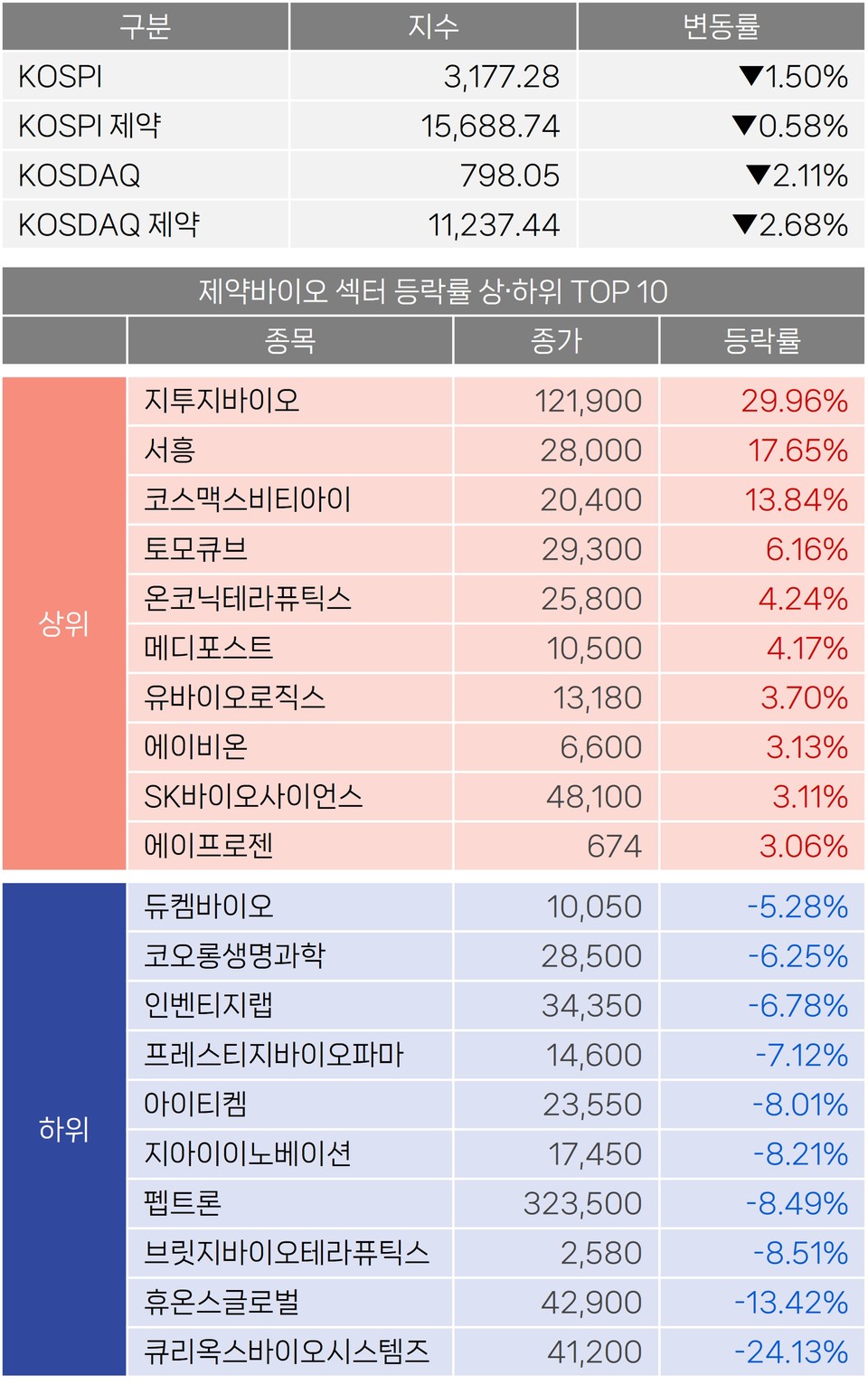 반면 일부 제약·바이오 종목들은 큰 폭의 하락을 기록했다. 큐리옥스바이오시스템즈는 24.13% 급락한 4만1200원에 마감해 낙폭이 가장 컸다. 휴온스글로벌(-13.42%), 브릿지바이오테라퓨틱스(-8.51%), 펩트론(-8.49%) 등도 두 자릿수 혹은 두 자릿수에 가까운 하락률을 보였다. 이 밖에도 지아이이노베이션(-8.21%), 아이티켐(-8.01%) 등 다수의 기업이 약세를 나타냈다.