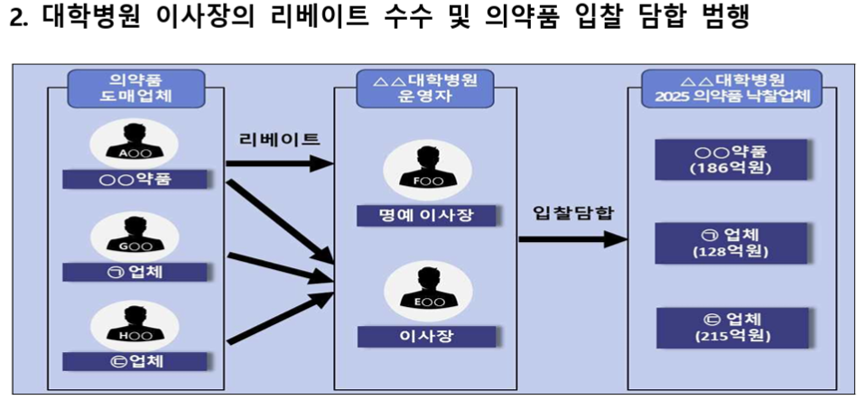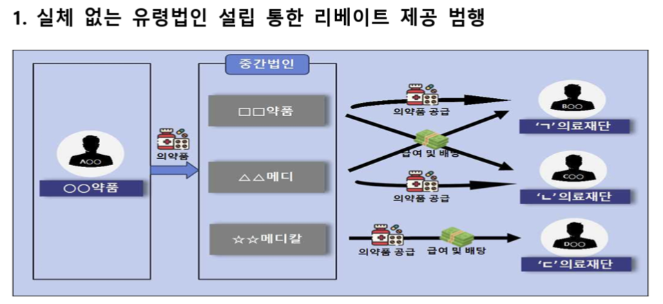 검찰에 따르면 의약품 도매상 ○○약품 대표 A씨는 실체 없는 유령법인을 설립해 종합병원 3곳에 의약품을 납품하고, 해당 법인의 지분을 병원 이사장의 가족 등이 보유하게 했다. 이후 배당금 명목으로 약 34억 원을 이들에게 지급하며 리베이트를 제공한 것으로 드러났다.