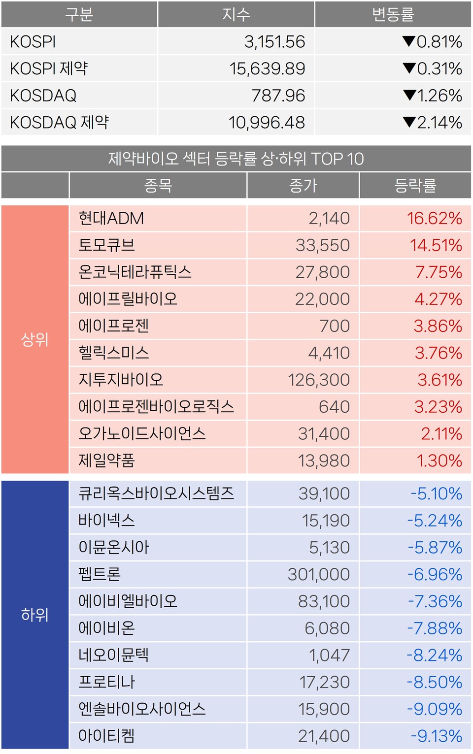 한편 제약바이오 섹터에서는 현대ADM(16.62%), 토모큐브(14.51%), 온코닉테라퓨틱스(7.75%) 등이 상승 상위를 기록했다. 반면 아이티켐(-9.13%), 엔솔바이오사이언스(-9.09%), 프로티나(-8.50%)는 하락률 상위권에 올랐다.