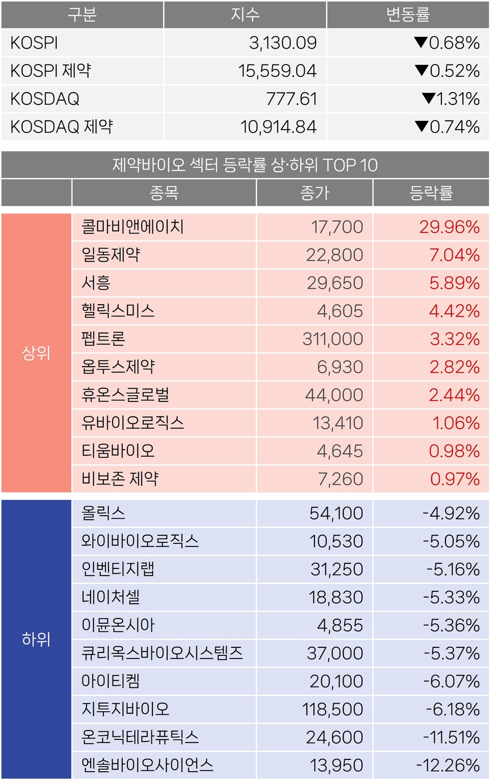 한편 제약바이오 섹터에서는 일동제약(7.04%), 서흥(5.89%), 헬릭스미스(4.42%) 등이 강세를 보인 반면, 엔솔바이오사이언스(-12.26%), 온코닉테라퓨틱스(-11.51%), 지투지바이오(-6.18%) 등은 하락 마감했다.