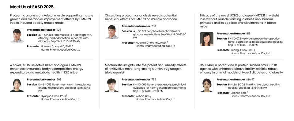주요 발표 내용은 △HM15275의 강력한 항비만 효과에 대한 기전적 통찰 △HM17321의 근육 성장 및 대사 개선 효과를 뒷받침하는 골격근 단백체 분석 △HM17321의 비만 영장류 모델에서 체중 감량 효능 및 설치류 모델에서 인크레틴 병용 효능 △HM17321의 체성분 개선, 에너지 소모 및 대사 건강 증진 효과 입증 △혈액단백체 기반 HM17321의 근육 및 골격 건강에 대한 잠재적 이로운 효과 △HM101460의 경구용 GLP-1 작용제 가능성 입증 등이다.