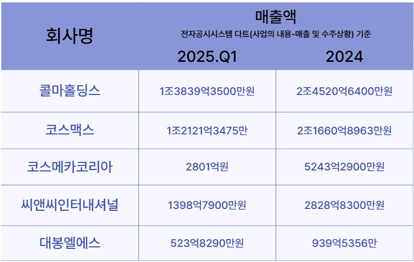 전자공시시스템 다트 반기보고서에 따르면(사업의 내용-매출 및 수주상황) △한국콜마 △코스맥스의 올해 상반기 실적은 1조원대를 돌파했고 △코스메카코리아 △씨앤씨인터내셔널도 1000억원대를 넘어섰다.
