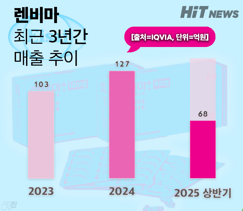 렌비마는 지난 2015년 10월 국내 허가받은 항암제로 현재 △갑상선암 △간세포암 △자궁내막암 △신세포암 등의 적응증에 폭넓게 쓰인다. 2015년 출시 당시에는 상대적으로 항암제 사용이 적었던 갑상선암이라는 단점이 있었지만 점차 적응증을 확장하며 의약품 시장조사기관 아이큐비아 기준 2023년 유통액 103억원을 기록해 블록버스터 자리에 올랐다. 지난해에는 127억원을 기록했으며 올해 상반기에만 68억원을 기록하며 전년도 기록을 넘어설 가능성을 높이고 있다.