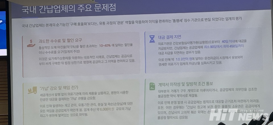배성윤 교수에 따르면 국내에는 △대형 전문 △재단 관련 △일반 등 3가지 유형으로 구성된 약 80~100개의 간납업체가 연간 2000억원 이상의 수익을 내고 있다. 하지만 특수거래를 금지하고 대금 지급 기한을 명확하게 규정한 약사법과 달리 의료기기법은 해당 항목을 규제하지 않아 간납업체의 불공정한 요구가 이어지는 상황이다.