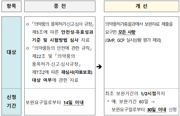 식약처는 이번 안내서 개정을 통해 △업체의 조정 신청 기한을 보완 요구일로부터 기존 14일에서 30일로 연장하고 △조정 신청 대상을 기존 안전성·유효성 심사자료, 품질 심사자료, 자료보호 대상 여부에 관한 자료에서 제조 및 품질관리기준(GMP), 임상시험 관리기준(GCP) 심사를 제외한 모든 보완요구 사항으로 확대한다.