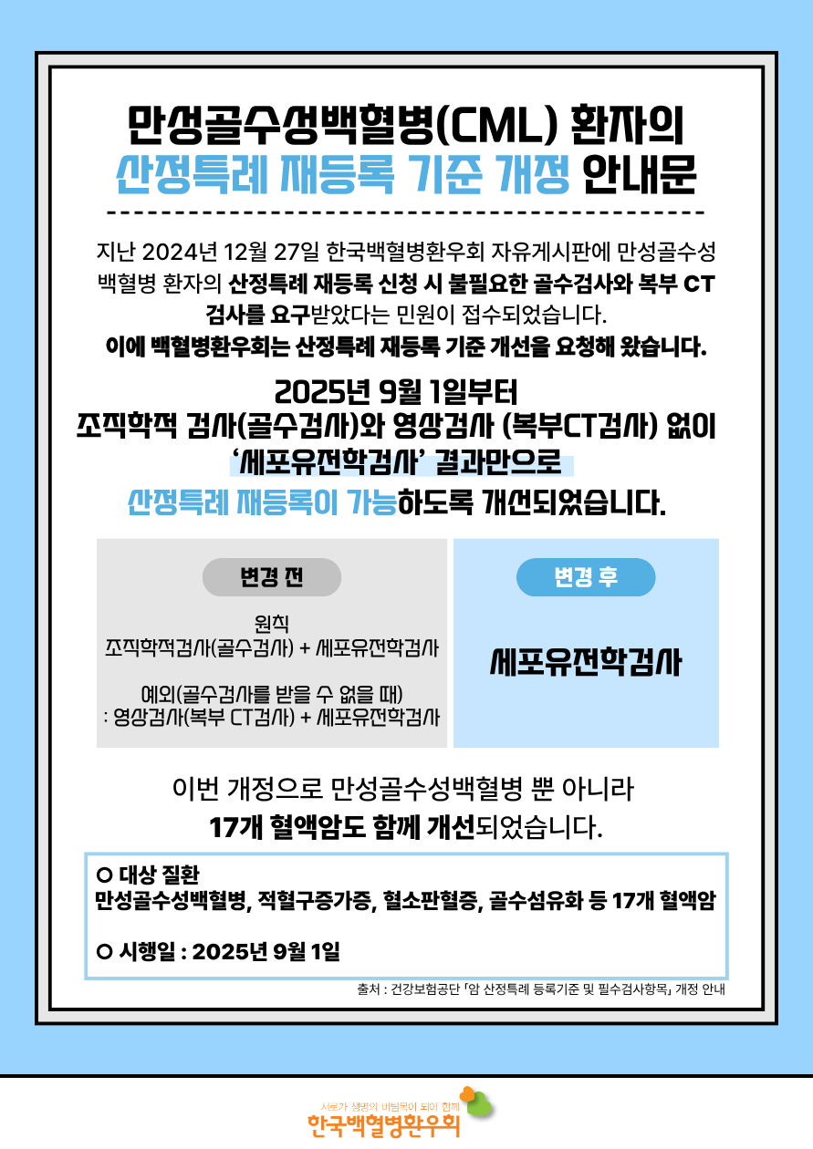 백혈병환우회는 "그동안 환자들이 5년마다 산정특례 재등록 과정에서 골수검사와 CT검사를 강요받아 육체적·정신적 고통을 겪고 불필요한 검사 비용을 부담해야 했다"며 "이번 개선으로 형평성 문제와 불합리한 부담이 해소됐다"고 평가했다.