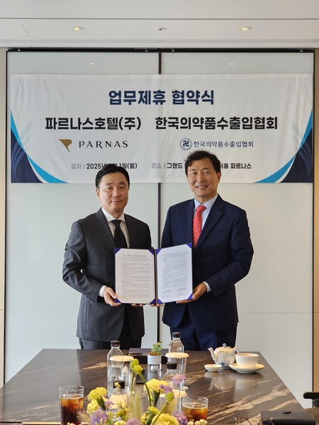 한국의약품수출입협회(의수협, 회장 류형선)와 파르나스호텔(대표이사 여인창)는 1일 'K-제약바이오 글로벌 성공을 위한 비즈니스 베이스캠프 구축'을 핵심 비전으로 하는 전략적 업무협약(MOU)을 체결했다고 밝혔다.