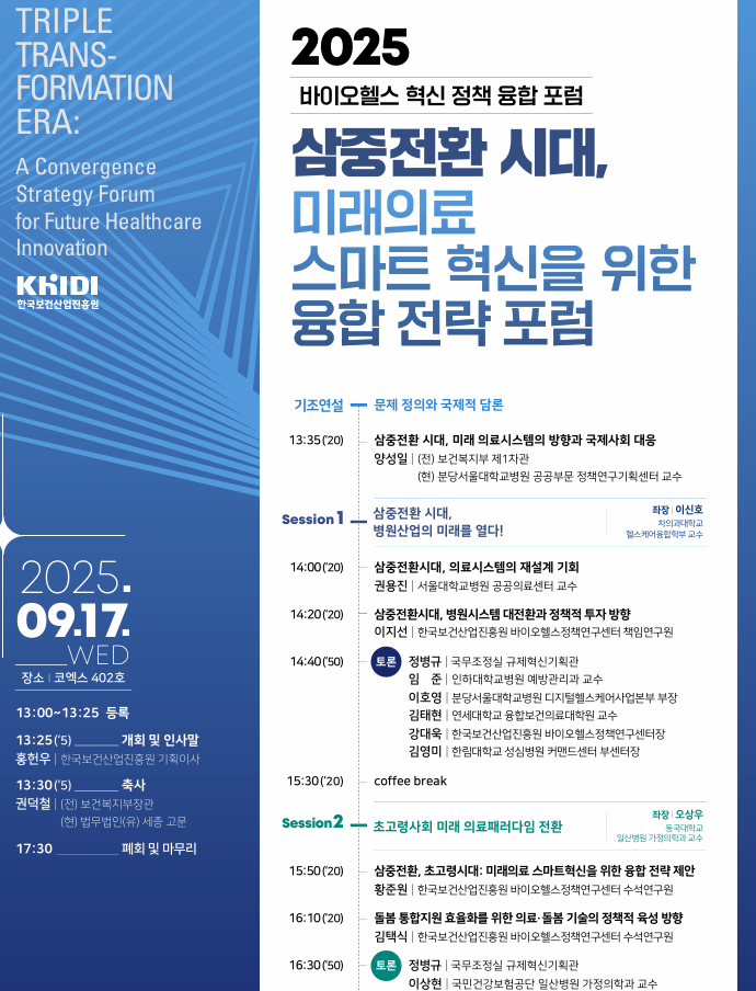 첫 번째 세션(좌장 이신호 차의과대학교 교수, 주제: 병원산업의 미래)에서는 권용진 교수(서울대학교병원 공공의료센터)가 △삼중전환시대, 의료시스템의 재설계 기회를, 이지선 책임연구원(보산진 바이오헬스정책연구센터)이 △병원시스템의 대전환과 정책적 투자 방향을 발표한다.