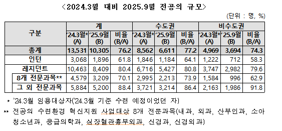 예년 대비 전공의 규모 비율을 연차별로 보면, 인턴 61.8%, 레지던트 80.4%이며, 지역별로는 수도권 수련병원이 77.2%, 비수도권 수련병원이 74.3% 수준을 회복한 것으로 나타났다. 과목별로는 정부의 수련환경 혁신지원 사업 대상인 8개 과목이 예년 대비 70.1%, 그 외 과목은 예년 대비 88.4% 수준으로 나타났다.