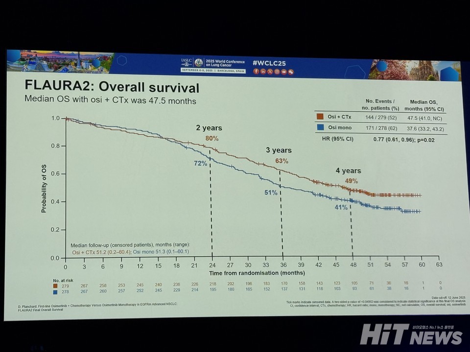FLAURA2 3상 연구서 OS 중앙값 47.5개월, PFS 29.4개월 확인