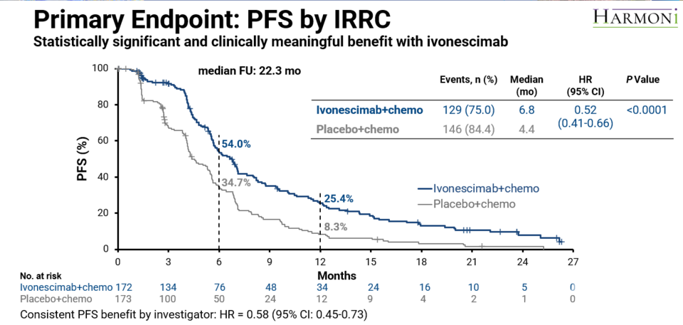연구 결과(중앙 추적 기간 22.3개월 시점), 이보네시맙 투여군의 PFS 중앙값(mPFS)은 6.8개월(95% CI: 5.7-7.1)로, 대조군의 4.4개월(95% CI: 4.1-5.5) 대비 48%의 질병 진행 또는 사망 위험 감소 혜택을 보였다(HR 0.52, 95% CI : 0.41-0.66, p<0.0001).