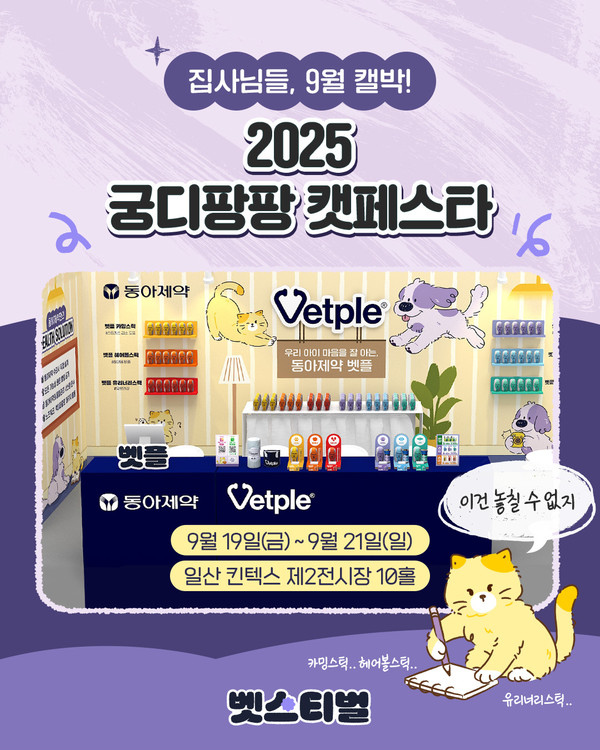 동아제약(대표이사 사장 백상환)은 자사의 마인드풀 펫 헬스케어 브랜드 '벳플' 브랜드를 알리기 위해 오는 19~ 21일 일산 킨텍스에서 열리는 '2025 궁디팡팡 캣페스타 일산'에 참가한다고 17일 밝혔다.