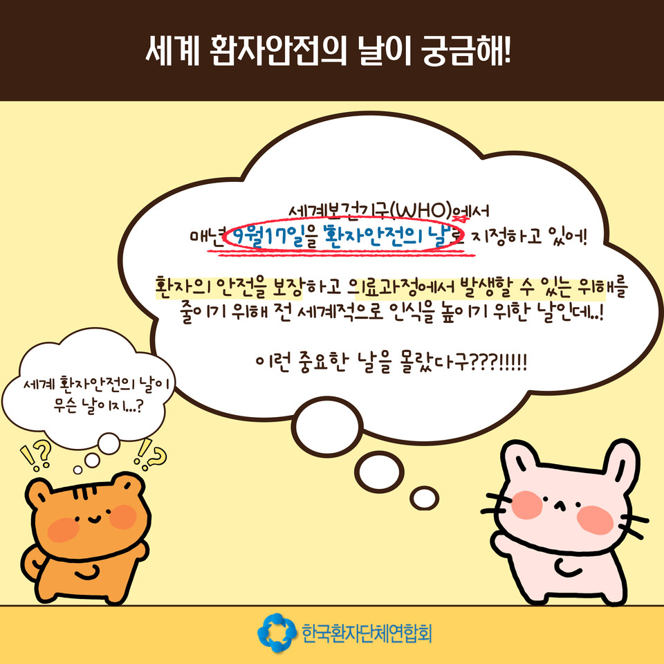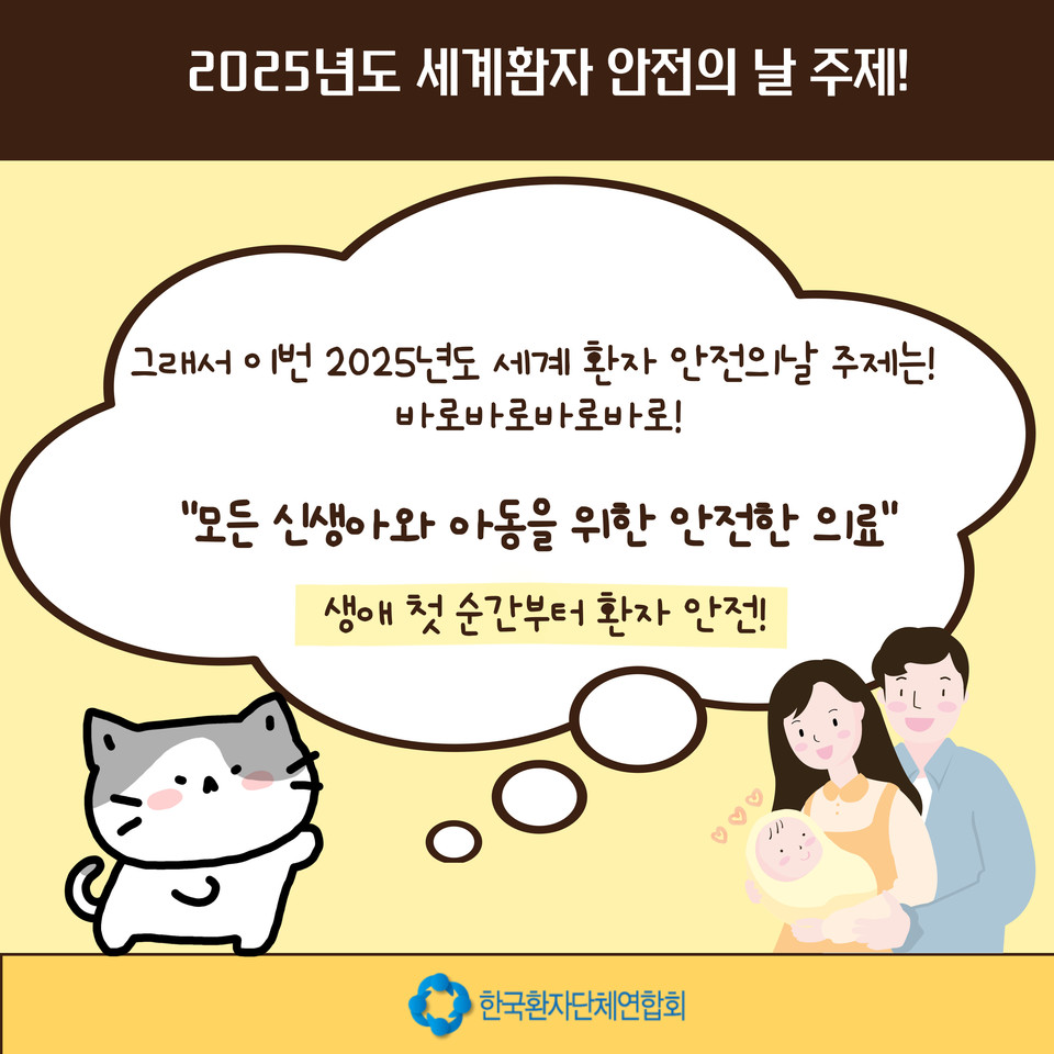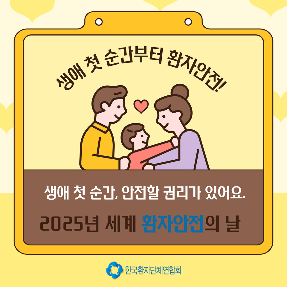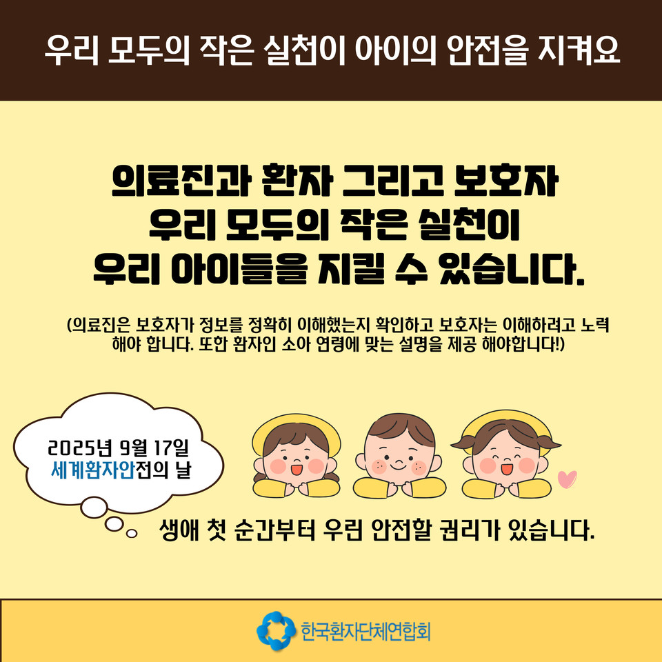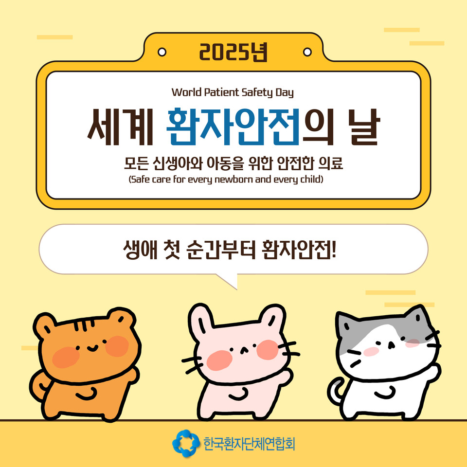 한국환자단체연합회(이하 환자단체연합회)는 2025년 세계 환자안전의 날을 맞아 "모든 신생아와 아동을 위한 안전한 의료(Safe care for every newborn and every child)"라는 올해의 주제에 맞춰 카드뉴스와 영상을 제작·배포한다고 17일 밝혔다.