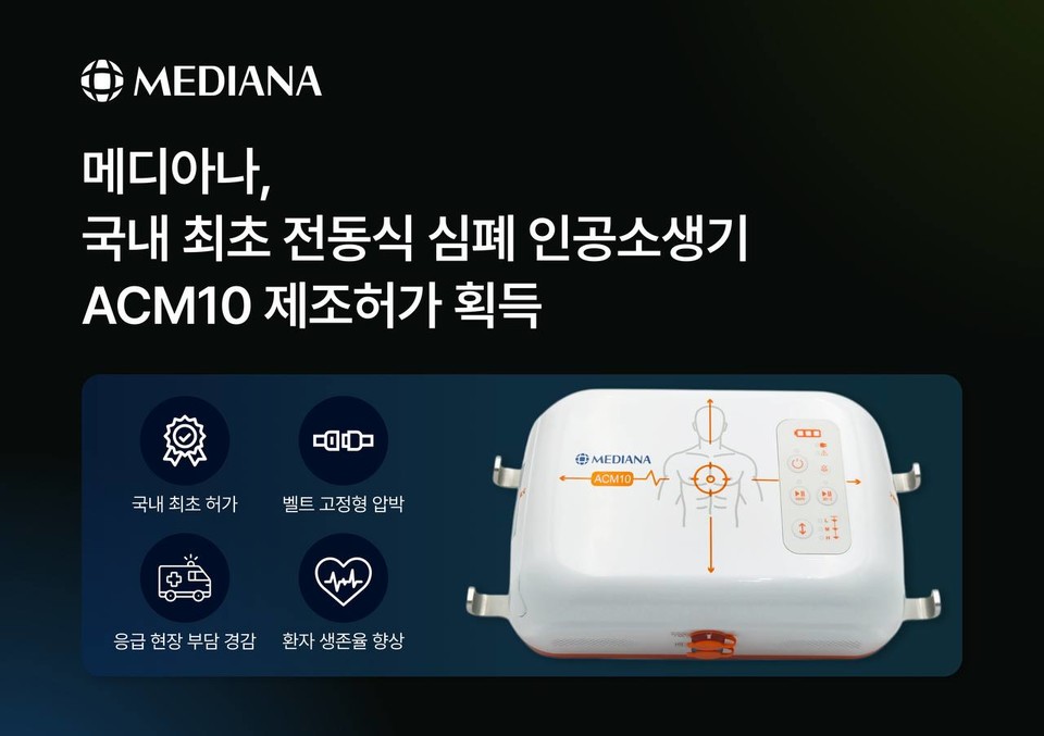 이성호 메디아나 사업대표 "ACM10 제조허가는 자사 기술·제조 역량을 입증한 성과"라며 "향후 환자감시장치·자동심장충격기·전문가용 심장충격기 등과 연계해 응급현장에서 단계별 처치가 연결되는 스마트 응급의료 솔루션으로 확장할 계획"이라고 말했다.