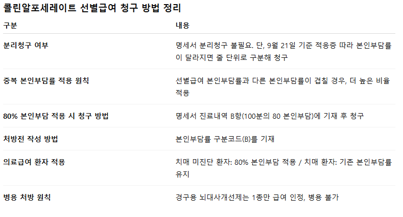특히 선별급여 본인부담률과 다른 본인부담률이 중복될 경우, 두 비율 중 더 높은 본인부담률을 적용해야 한다. 본인부담률 80%가 적용되는 경우는 명세서 진료내역의 B항(100분의 80 본인부담)에 기재해 청구해야 하며, 처방전에는 본인부담률 구분코드(B)를 기재하도록 규정됐다.
