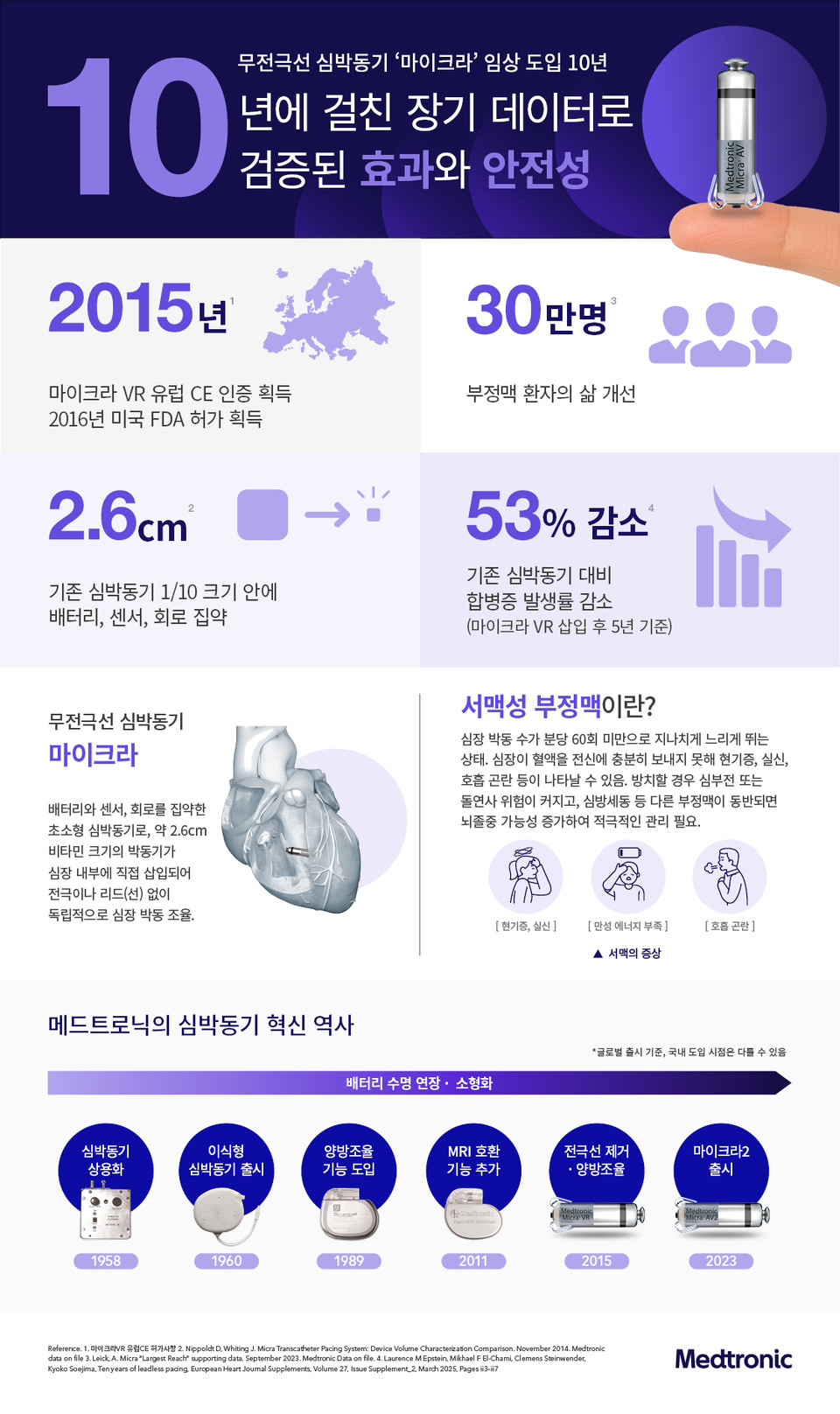 마이크라 AV로 치료받은 미국 메디케어 가입자 7471명을 추적한 결과에서도 2년 시점에 5.3%의 중증 합병증 발생률을 보였다. 이를 통해 기존 심박동기 대비 일관되게 낮은 합병증 발생률을 입증했다는 게 회사 측 설명이다.