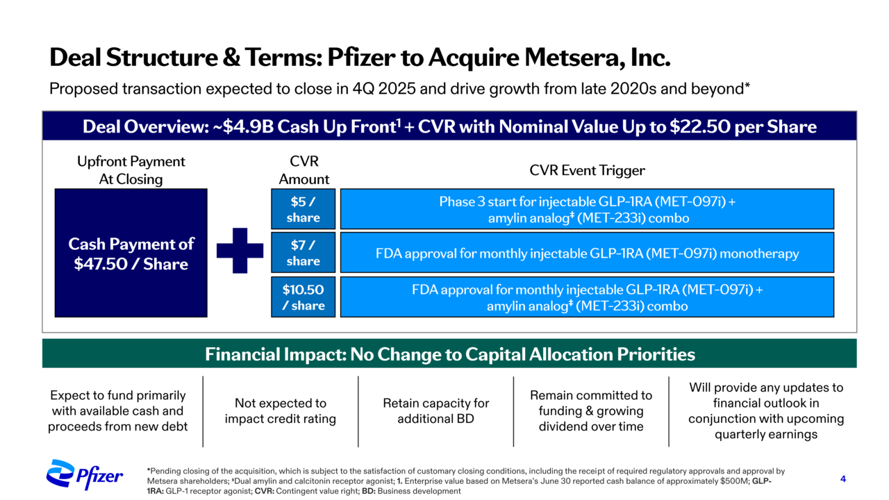 추후 화이자는 마일스톤에 따라 멧세라 측에 최대 주당 22.50달러를 지불할 계획이다. 세부적으로 ①MET-097i(주사제)+MET-233i(주사제) 병용요법의 3상 임상 시험 시작 시 주당 5달러 ②월 1회 MET-097i 단일요법의 미국 식품의약국(FDA) 승인 시 주당 7달러 ③월 1회 MET-097i+MET-233i 병용요법의 FDA 승인 시 주당 10.50달러 등이 지불된다.