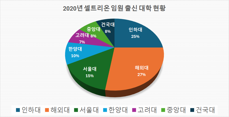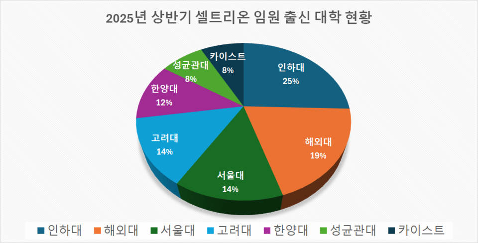 해당 분석은 2020년 상반기 임원 인적 구성을 토대로 셀트리온과 셀트리온 헬스케어 사업보고서를 기준으로 작성됐다. 2023년 양사의 합병 이전 임원 구성을 반영하기 위한 것으로 임원 2020년 상반기와 2025년 상반기 데이터를 비교한 기사다
