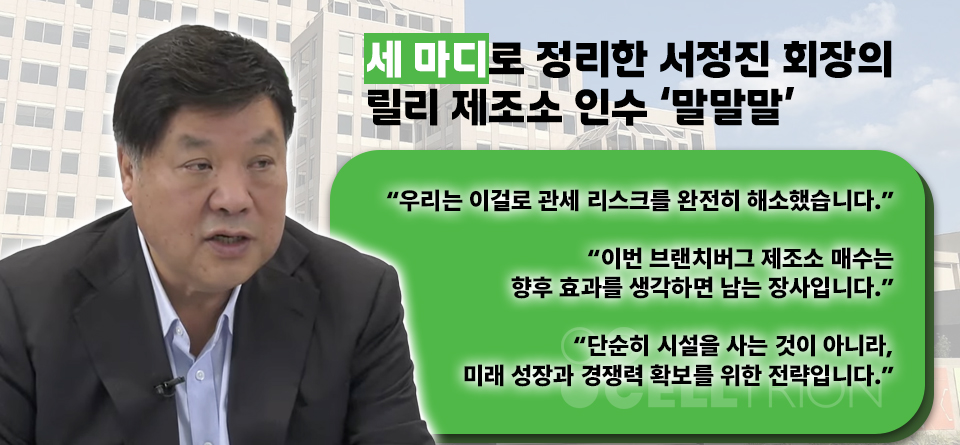 셀트리온이 미국 뉴저지 브랜치버그 제조시설 인수를 발표하면서 서정진 회장은 관세 리스크 해소가 이번 계약의 핵심 이유라고 강조했다. 그는 간담회에서 "우리가 이번 시설을 인수함으로써 미국으로 수출할 때 발생하던 관세 문제를 완전히 없앴다. 지금까지는 해외 수출 제품마다 관세 부담 때문에 가격 경쟁력에 제약이 있었는데, 이번 인수로 그 문제가 완전히 사라졌습니다"고 강조했다.
