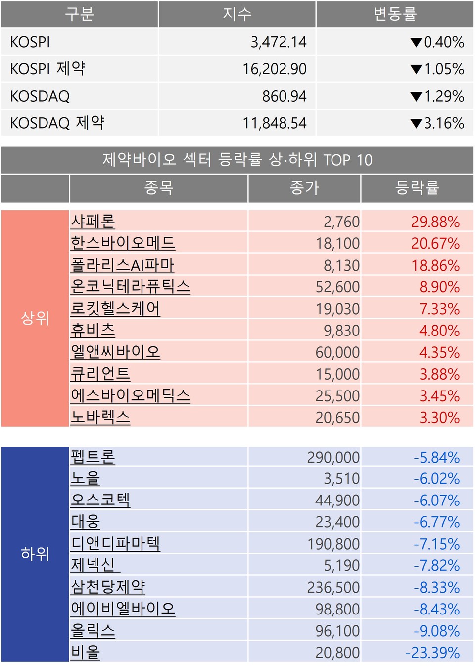 한편 이날 코스피와 코스닥 지수가 나란히 하락 마감했다. 대형주의 약세와 외국인·개인 매도세가 지수에 부담을 준 것으로 풀이된다. 코스닥 시장에서 제약·바이오주의 경우 펩트론은 8%대 급락했고, 알테오젠과 에이비엘바이오도 약세를 기록했다.
