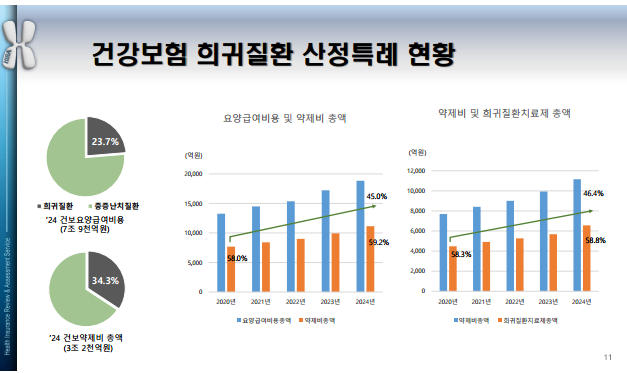 재정 부담은 이미 통계로 확인된다. 국내 희귀질환 환자 수는 2020년 37만 명에서 2024년 47만 명으로 5년 사이 26% 증가했고, 같은 기간 요양급여 비용은 42% 늘었다. 건강보험 총 요양급여비에서 약제비 비중은 59.2%를 차지하며, 특히 희귀질환 치료제 약제비는 전체 약제비의 60%에 달한다.