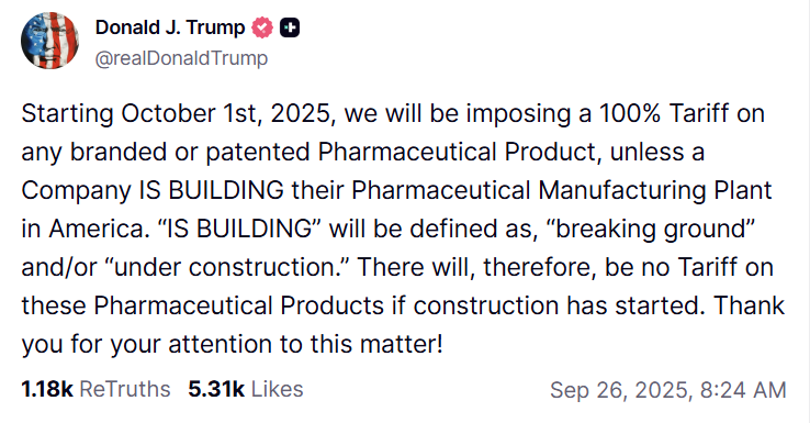 도널드 트럼프 미국 대통령이 오는 10월 1일부터 브랜드 또는 특허가 있는 수입 의약품에 대해 100% 관세를 부과하겠다고 26일(현지시간) 밝혔다.