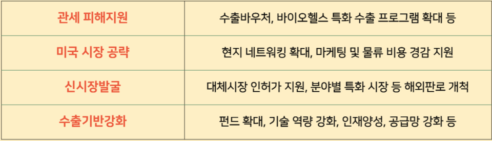 이에 따라 정부는 △수출바우처 및 바이오헬스 특화 수출 프로그램 확대 △현지 네트워킹 강화와 물류·마케팅 비용 지원 △대체시장 인허가 지원과 해외 판로 개척 △펀드 확대, 기술 역량 및 인재양성, 공급망 강화 등 전 과정에 걸친 지원책을 추진할 계획이다.