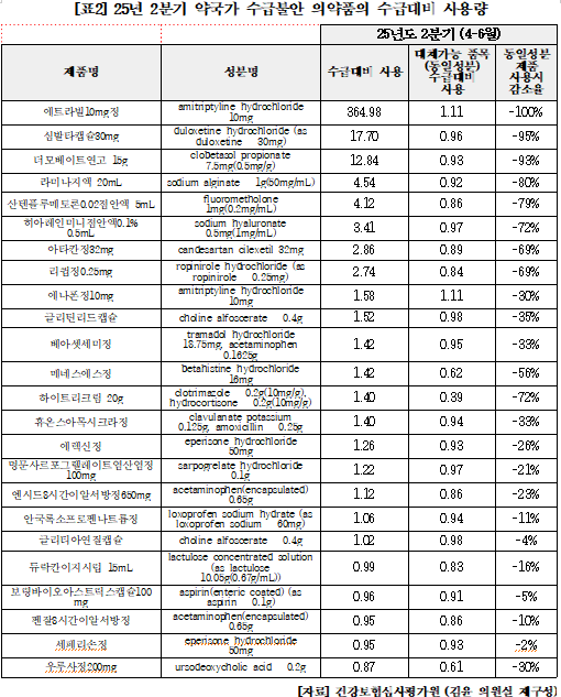 김윤 의원실, 25년도 1000회 이상 약국 품절 호소 72개 품목 분석