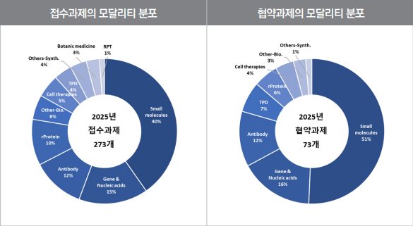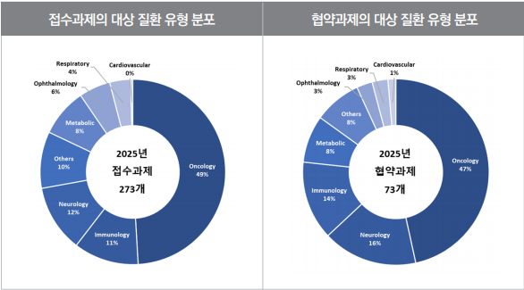 대다수의 기업들은 항체, 유전자치료제 모달리티를 가진 종양학 질환 분야의 과제에 접수한 것으로 나타났는데, 접수 개수에 비례해 선정이 이뤄진 것으로 나타났다. 즉 많이 지원한 분야에서, 많이 선정된 것이다.