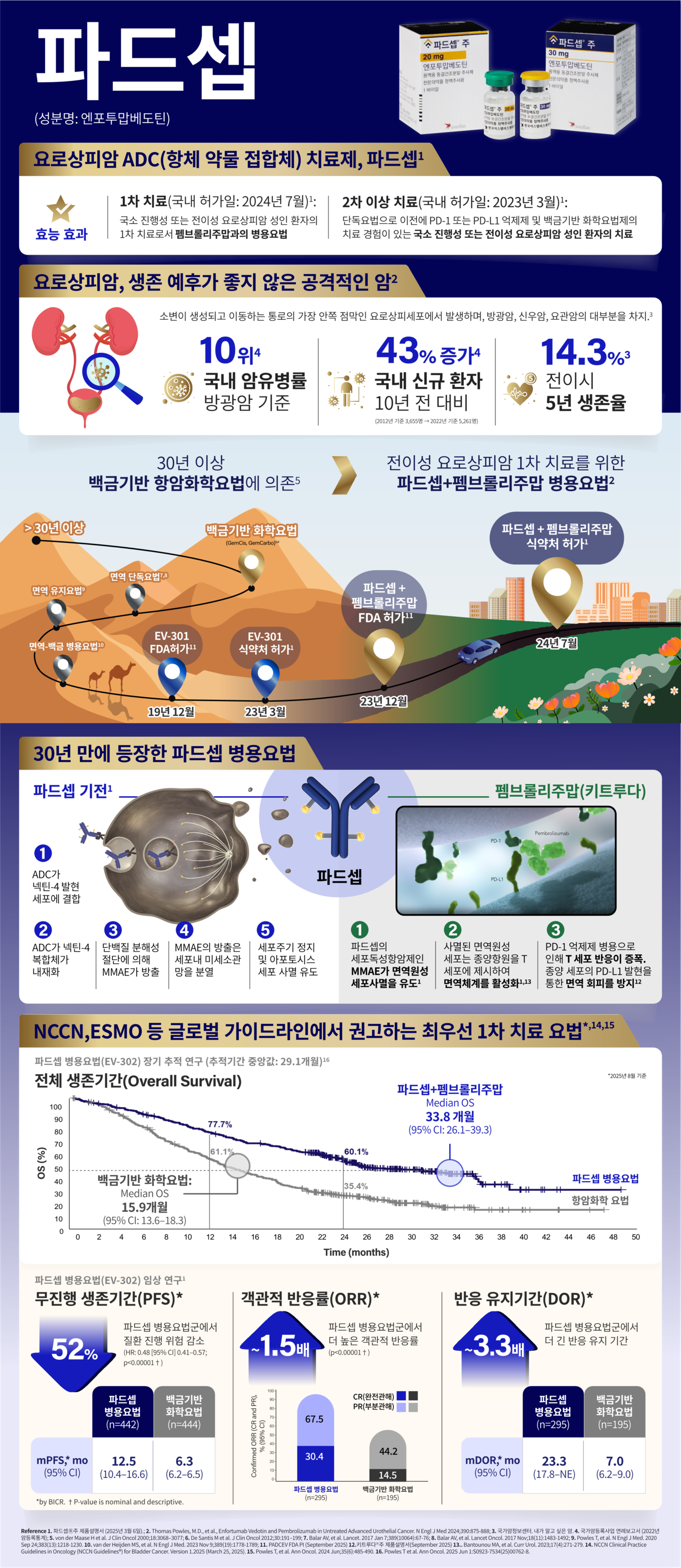 파드셉은 2023년 3월 10일 전이성 요로상피암 2차 치료 단독요법으로 국내 허가된 이후, EV-302 연구 결과를 바탕으로 2024년 7월 25일 키트루다와의 1차 병용요법으로 적응증을 확대했다.