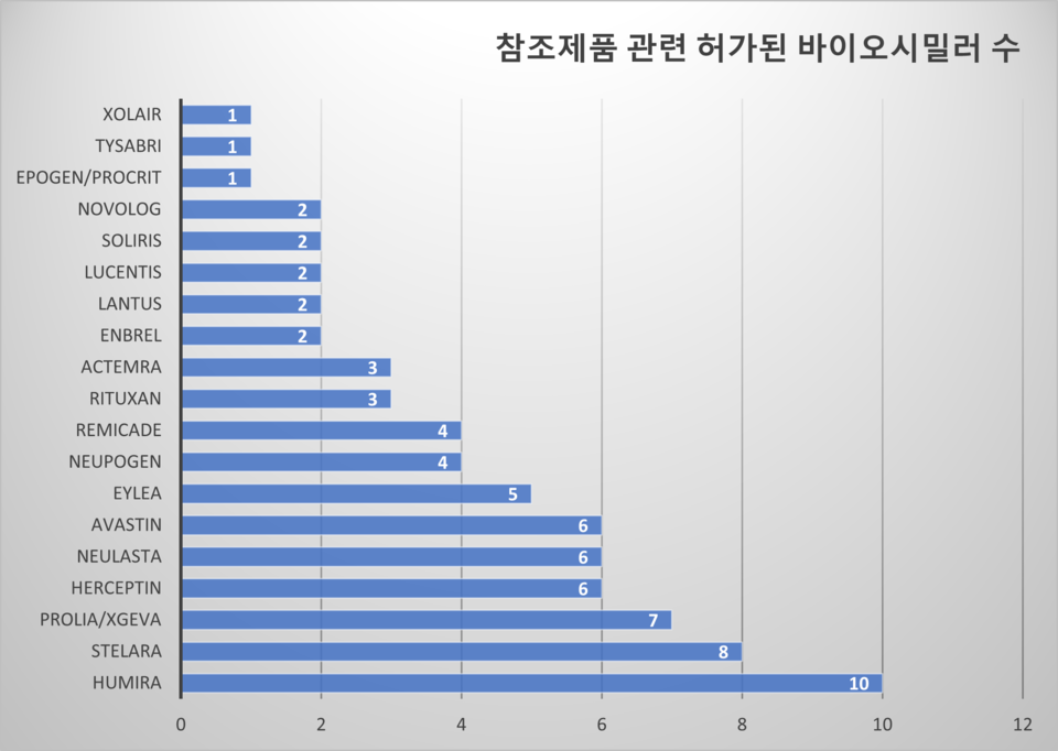 참조제품별 승인 현황을 보면 휴미라가 10개로 가장 많았고, 스텔라라 8개, 프롤리아 7개, 허셉틴, 뉴라스타, 아바스틴이 각각 6개였다. 이어 아일리아 5개, 뉴포젠과 레미케이드가 각각 4개, 리툭산과 악템라가 3개, 엔브렐, 란투스, 루센티스, 솔리리스, 노보로그가 각각 2개 승인됐다.