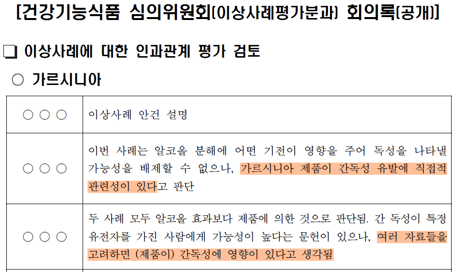 실제 식약처 '건강기능식품 심의위원회(이상사례평가분과) 회의록'에서는 다수의 심의위원이 "가르시니아 제품이 간독성 유발에 직접적 관련성이 있다고 판단한다"고 밝힌 대목만 등장한다. 품질, 제조공정 등에 관련된 언급은 찾아 볼 수 없다.