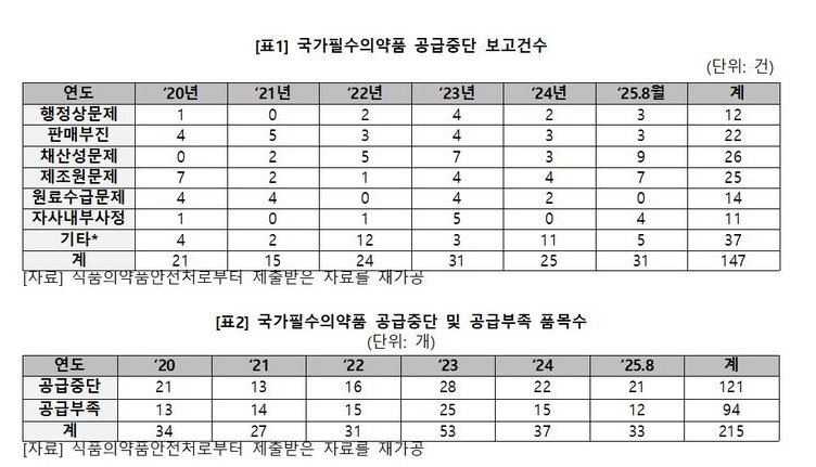 같은 기간 공급중단·공급부족 품목 수도 총 215개에 달했다. 올해 8월 기준으로만 보면 공급중단 품목이 21개, 공급부족 품목이 12개로 확인돼, 매년 공급 차질이 반복되고 있는 상황이다.