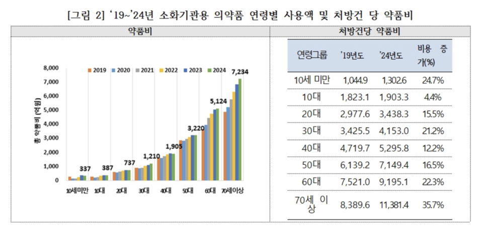 연령별로 보면, 고령층에서 위장약 사용이 특히 많았다. 2024년 기준 70대 이상이 사용한 위장약 약품비는 7234억 원으로 전체의 36%를 차지했으며, 처방건당 약품비는 1만1381원으로, 10세 미만(1,303원)의 8.7배에 달했다.