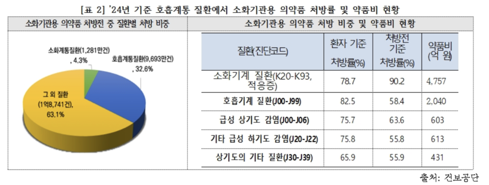 전체 위장약 처방 중 호흡기 질환 관련 처방이 33%(1억 건)에 달했으며, 이에 따른 약품비는 2000억 원 규모로 집계됐다. 특히 감기(급성 상기도 감염) 처방전의 63.6%에 위장약이 포함되어 있었고, 이로 인한 약품비는 603억 원이었다.